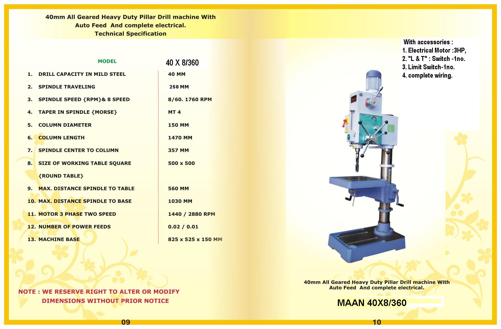 Pillar Drill MachineOur pillar drilling machines are a valuable tool for any workshop. We come up with a variety of models and serve for many different purposes. The pillar drill is also called drill press, and it comprises a base, pillar, column, spindle and a drill head. Our machines are engineered to be more accurate and reliable. Also, we develop drilling machines for both small and industrial workshop. There are some models with several attachments and accessories, giving greater capability to handle large projects. We ensure that our pillar drill machines are adaptable and easy to handle. Features & Benefits: